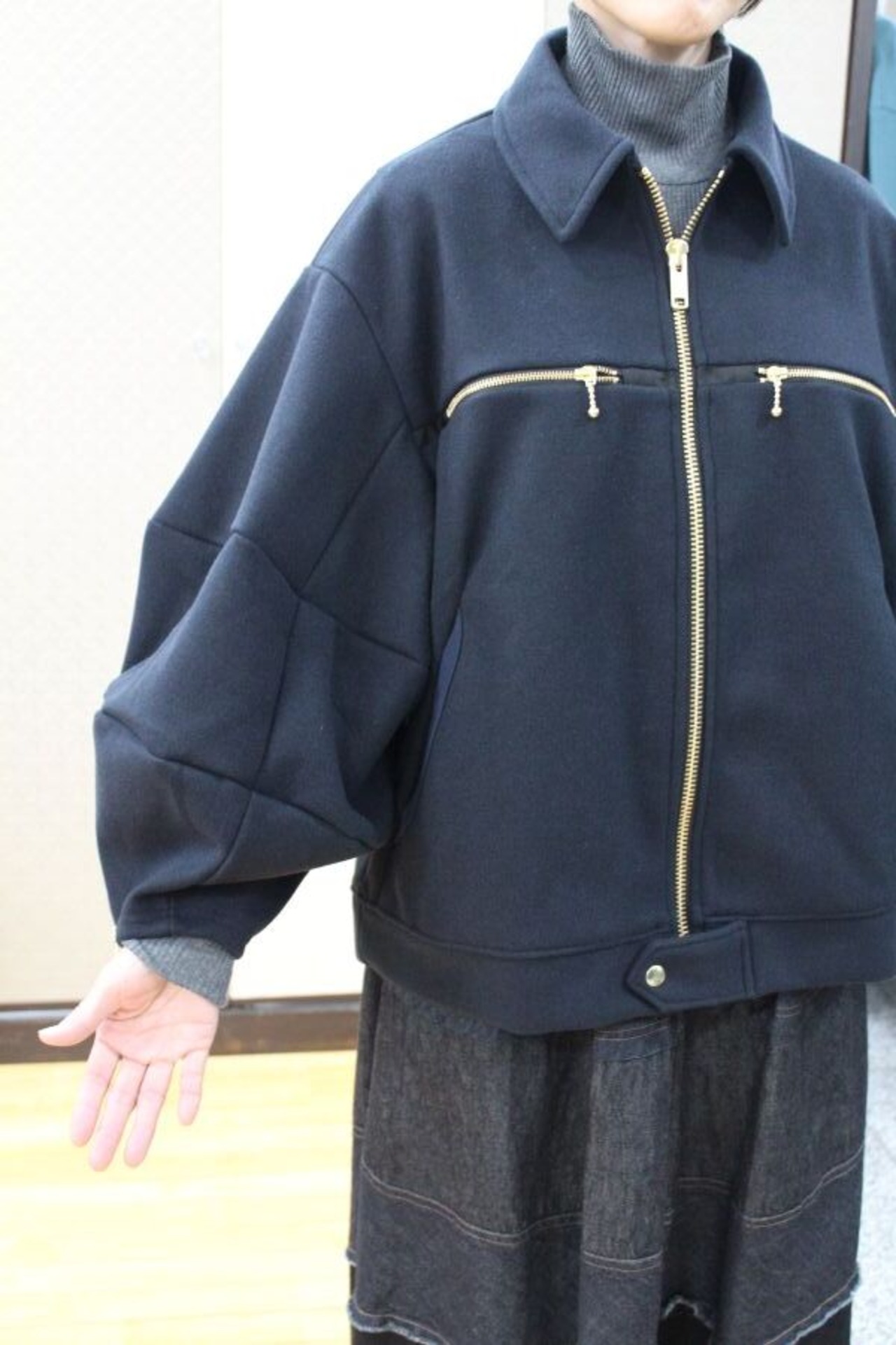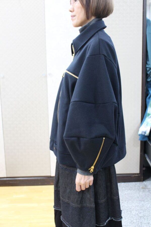 付属のファスナーやパッチボタンが金色で高級感のあるディティールにこだわったブルゾン。