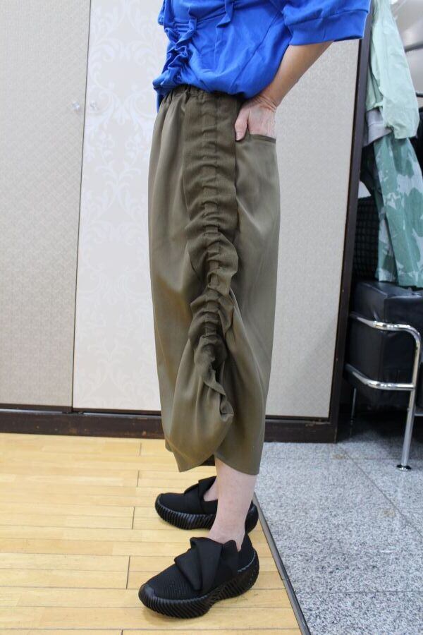 サイドにゴムを使ってシルエットを作り出したデザインパンツ。