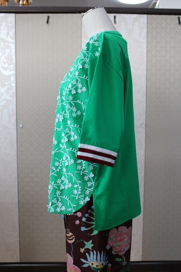 前身頃にボタニカルレースの生地を使用し、後ろにはスムースの生地を合わせています。