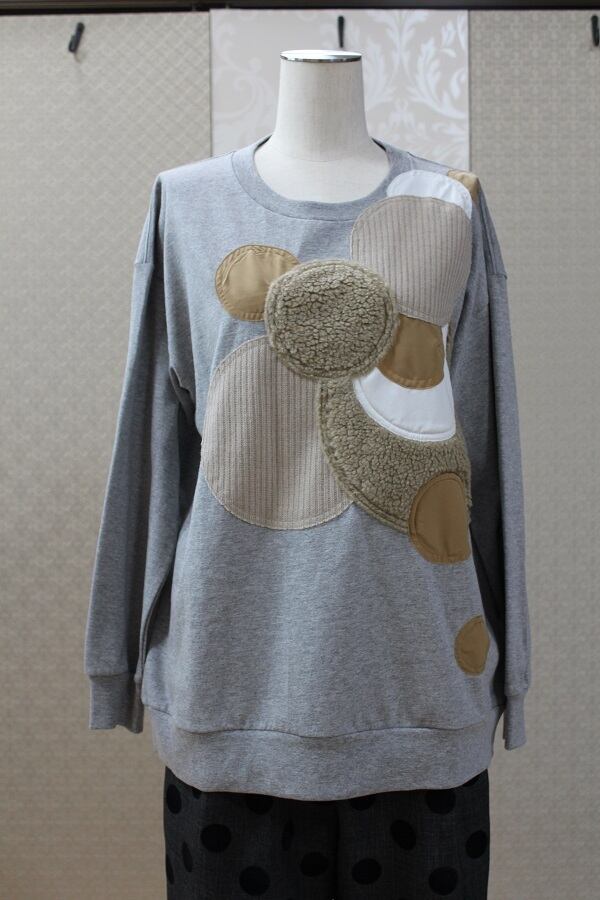 ボア、リブ、布帛素材で、大小のドットをランダムにパッチワークした遊び心のあるアイテム。