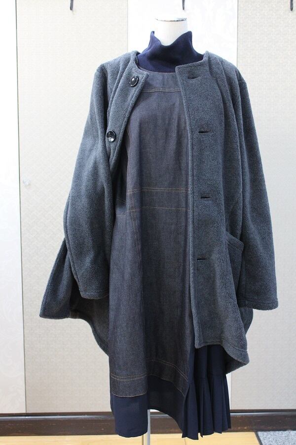波状の切り替えによって立体的なシルエットを作り、どの角度から見ても素敵なモードなコート。ノーカラーで今年っぽく。