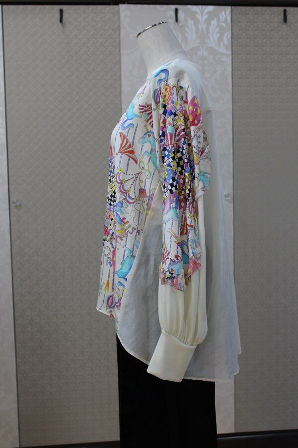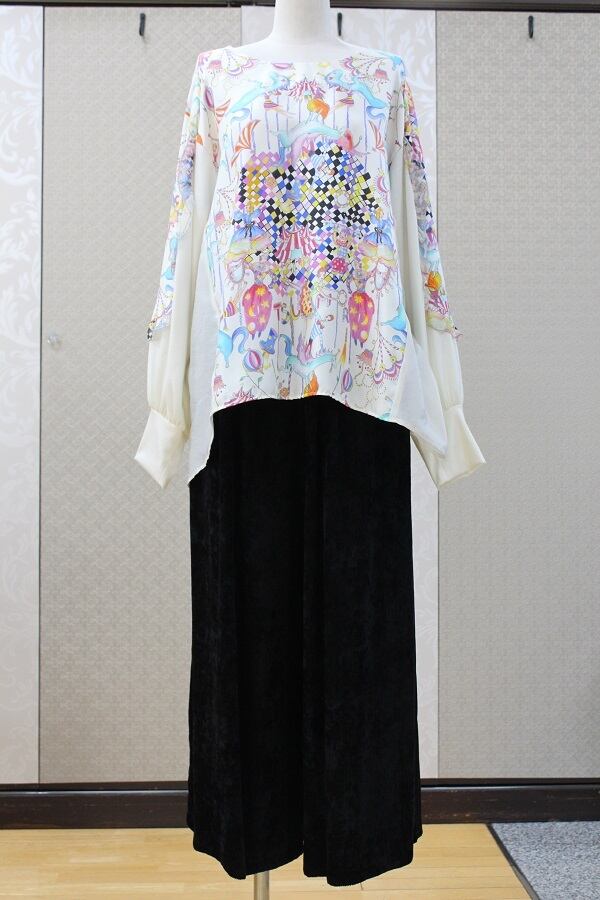 シルクツイルにプリントされた空中ブランコ、踊るシャンデリア、鏡をもったピエロ、空中を駆け回るユニコーン、雲の上で両手をあげてTSUMORI CHISATOのサーカスショーの世界。