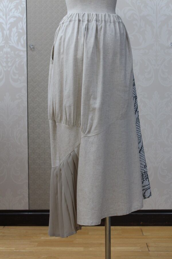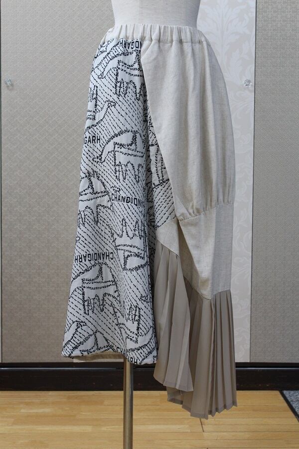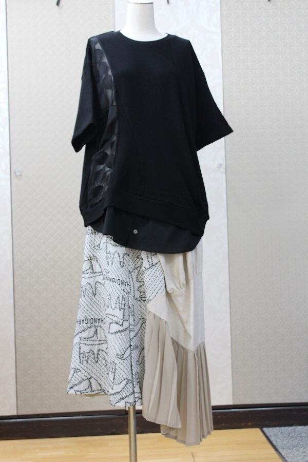 刺繍のように緻密なデザインのオリジナルジャガード×無地とタックをミックスし、アシンメトリーに切替た