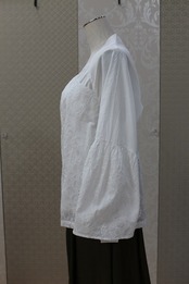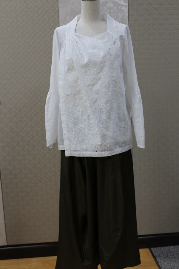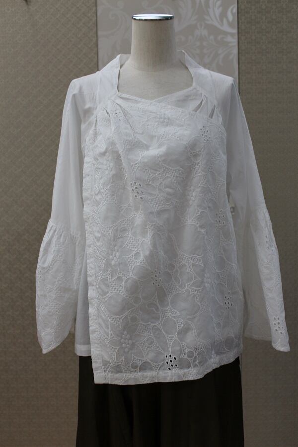 綿ローンの生地ボタニカルなフラワー刺繡を施したブラウス。