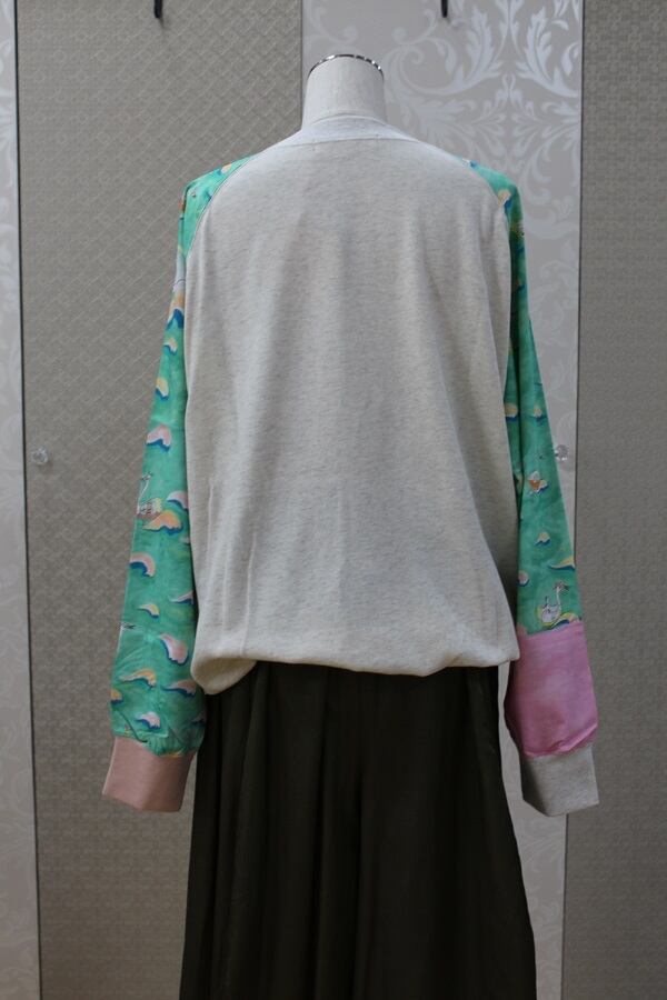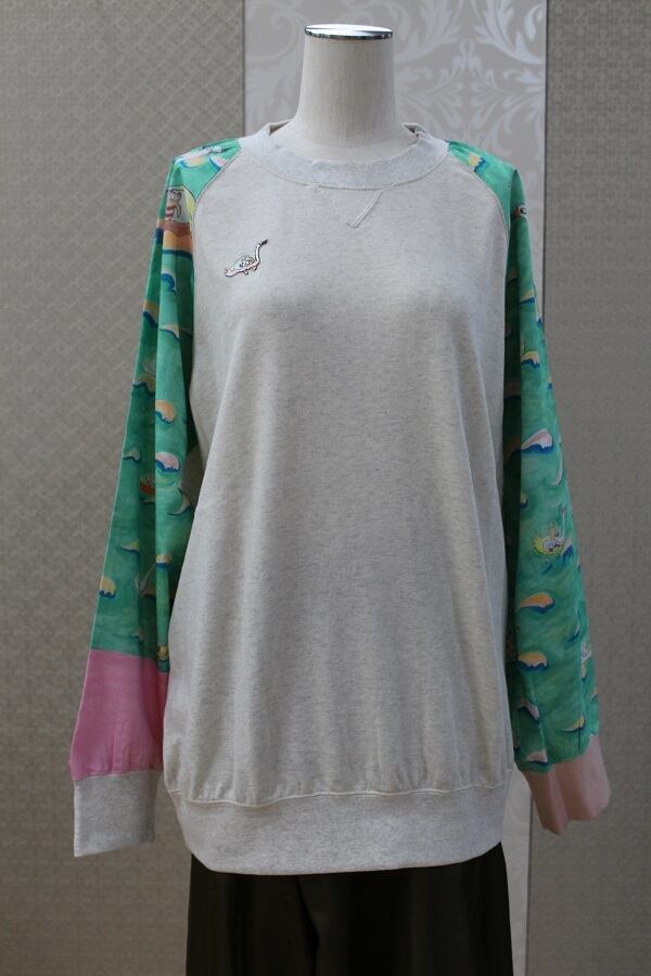 ツモリチサトの描くスワンボートと水面に波打つウェーブを袖にプリントしたミニ裏毛のプルオーバー。
