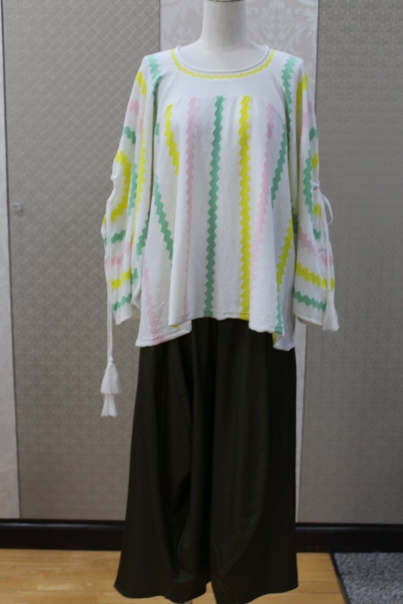 ピンク×ミント×イエロー×ホワイトのカラーをジグザグに編み出したインターシャニット