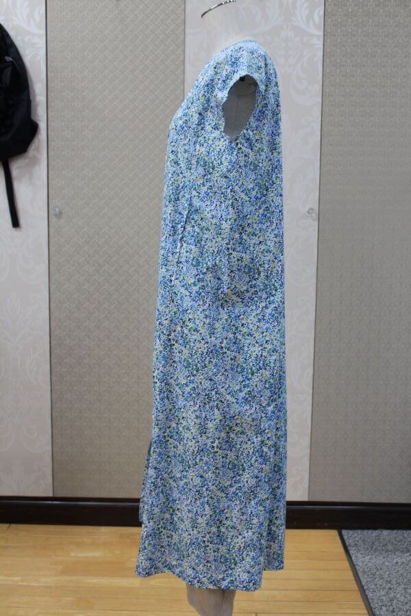 胸部分にタックが入ったシンプルなワンピース。LIBERTYプリントの柄を存分に味わえる主役級な1着☆身幅リラックス感がありながら、肩幅から裾までの直線シルエットによってすっきりとしたラインのデザイン。 前側の裾にアシンメトリーに入ったスリットがポイント。ボトムスをレイヤードしても良き♡