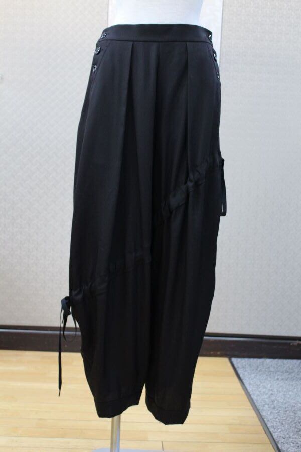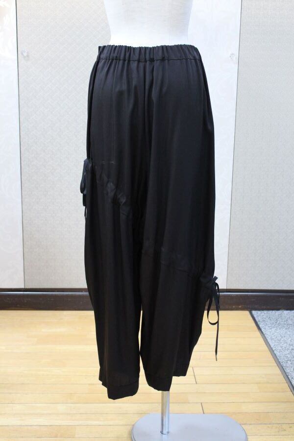 柔らかく、ドレープ性があり、落ち感が綺麗なテキスタイルがドローストリングにマッチしてサイドの紐でお好みのシルエットに出来るパンツ。