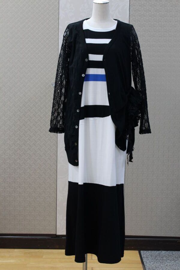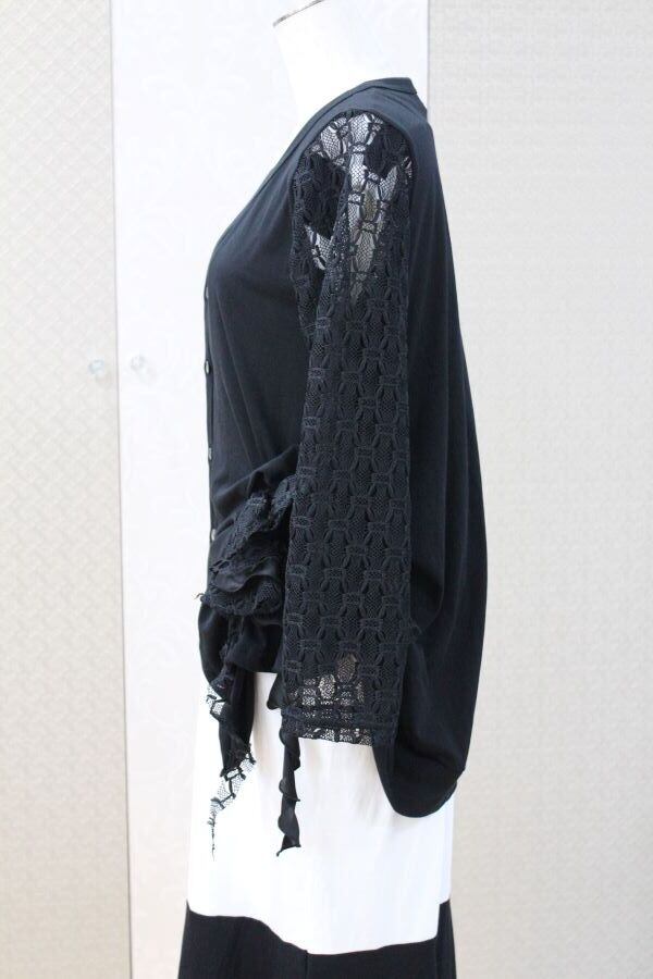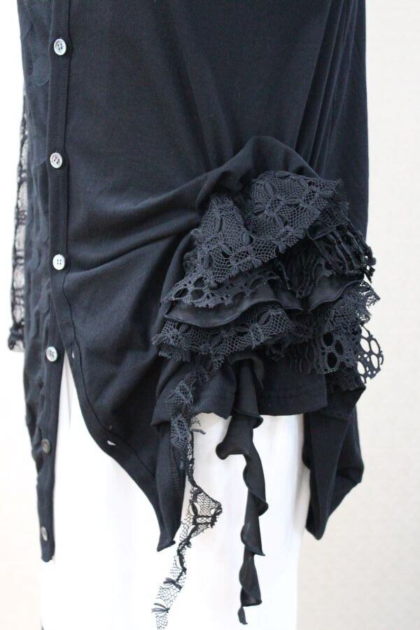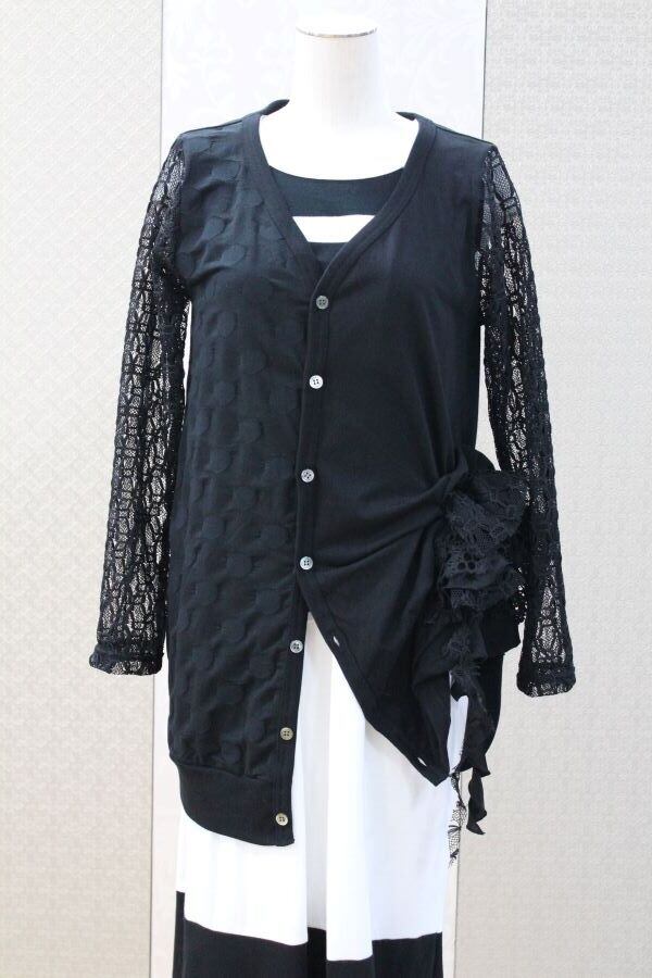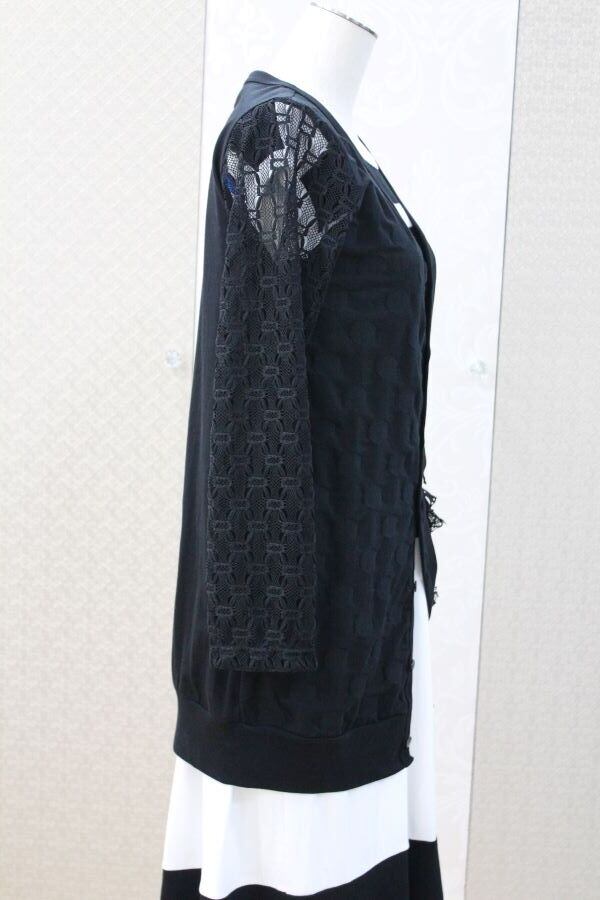 アシンメトリーにコサージュのようなモチーフを、タックで仕上げレースをふんだんに使ったエレガントスタイルに合うカーディガン。