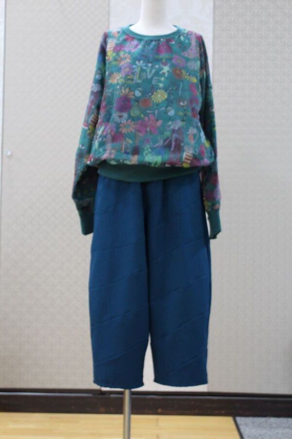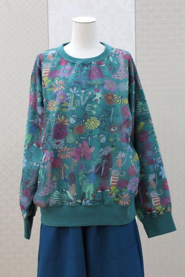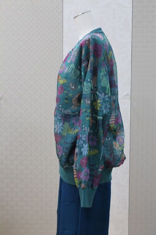ツモリチサトらしいファニーフラワーのイラストプリントが表地のオーガンジーにプリントされて、ベースになる部分は裏毛パイルのスウェット素材☆